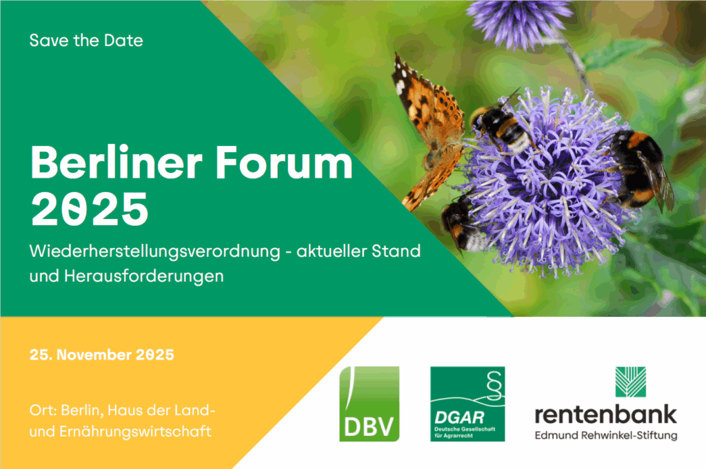 Das Berliner Forum 2025 findet am 25. November im Haus der Land- und Ernährungswirtschaft in Berlin statt. Die Veranstaltung wird gemeinsam von der DGAR, der Edmund Rehwinkel-Stiftung und dem DBV organisiert. Im Mittelpunkt steht in diesem Jahr das Thema „Wiederherstellungsverordnung – aktueller Stand und Herausforderungen“.